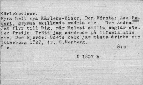//// Kärleksvisor. . - //// Fyra helt nya Kärleks-Y/isor, Den Fcrsta: äok H07 bert, grymma skillnads smärta etc. Den Andrad" Jag flyr till Dig, när Molnet stilla seglar etc. Den Tredje: Trött jag vandrade på lifwets stift etc. Den Fjerde; ödete kalk ja<r nåste dricka etc G-ötheborg 1827, tr. S.Norberg. 8 B. 8:0 //// K 1827 h ////