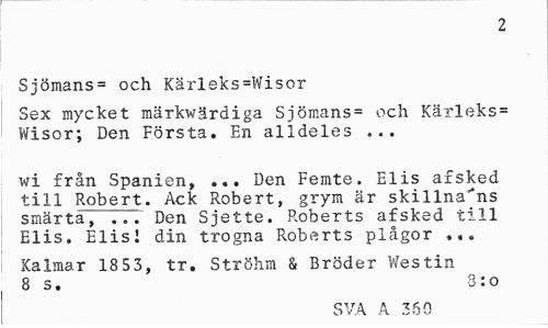 //// 2 //// Sjömans= och Kärleks=Wisor //// Sex mycket märkwärdiga Sjömans= och Kärleks= Wisor; Den Första. En alldeles ... //// wi från Spanien, ... Den Femte. Elis afsked till Robert. Ack Robert, grym är skillna^ns smärta, ... Den Sjette. Roberts afsked till Elis, Elisl din trogna Roberts plågor ... //// Kalmar 18 53, tr. Ströhm & Bröder Westin 8 s. 8: o //// SVA A 360 ////