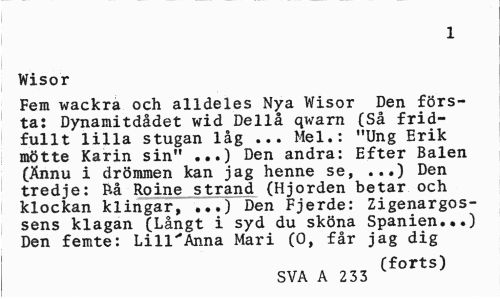 //// 1 //// Wisor //// Fem wackra och alldeles Nya Wisor Den första: Dynamitdådet wid Dellå qwarn (Så fridfullt lilla stugan låg ... Mel.: "Ung Erik mötte Karin sin" ...) Den andra: Efter Balen (Ännu i drömmen kan jag henne se, ...) Den tredje: Rå Roine strand (Hjorden betar och klockan klingar, ...) Den Fjerde: Zigenargos-sens klagan (Långt i syd du sköna Spanien...) Den femte: Lill^Anna Mari (0, får jag dig //// (forts) //// SVA A 233 ////