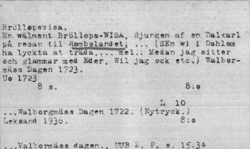 //// Bröllspsviaa, //// En wälment Bröllops-WISA, Sjungen af en Dal<arl på rSsan til Rocib oland et; ... (SEn wi i DahlotK ha lyckta at trada . . . 7 "me 1.. Medan jag sitter och glammar med Eder, Wil jag ock etc.) 7/albor-.-näss Dagen 1723. Uo 1723 //// 8 s. 8:o //// L 10 //// ...Walborgmäss Dagen 1722. (Nytryck.) Leksand 193&- 8;o //// V a IV r\ <2 a A z* rf mn TTfrR / V o 1 C 1/1 ////