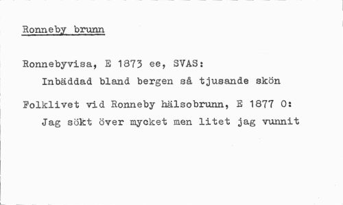 //// Ronneby brunn //// Ronnebyvisa, E 1873 ee, SVAS: //// Inbäddad bland bergen så tjusande skön //// Polklivet vid Ronneby hälsobrunn, E 1877 0: Jag sökt över mycket men litet jag vunnit ////