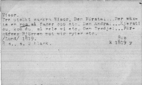 //// V-; sor. //// "re' utsökt wackra Wisor, Den Första; , . .Per wäx- //// t.e rjÄ-så f af?er opp et? . Den Andra. ,, .K jer »t 5 //// du, k 07! d-.. sX v el * %-t * te. De« Tredje: ., .För- //// -¦:5.fve*r W örren rot mir ryter etc . /Lur i/ I Bl9- B; o B s., s. c: Mark . it 1819 y ////