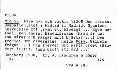 //// VISOR //// N:o 57. Fyra nya och vackra VISOR Den första: Bombattentatet i Madrid (I Madrid, Spaniens hufvudstad Ett grymt ett blodigt ... Egen melodi) Den andra: Hinduflickan (Hvad är det som sårar och sargar mitt hjärta? ..,) Den tredje: Den öfvergifne (Hulda Rosa, Wilhelm frågar ...) Den fjerde: Det sista ordet (Bindeln fallit, ännu blott ett ord ...) //// Göteborg 1906, tr. A. Lindgren & Söner 8 s. 8:o //// SVA A 286 ////
