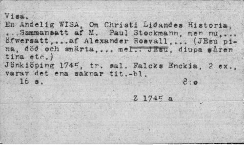 //// Vi sa. //// Et! And el i g WISA, Om Christi Lidandes Historia, //// Sammansatt af M. Paul otockmann, nen nu,. .. ö.fwersatt,.. .af Alexander Rosvall, .. . (JBsu pina, död och smarta,... m e FTT-^yffSti, djupa »åren tina etc,) //// Jönkiöping 174*, tr. sal. Falcks Knckia, 2 ex., varav det ena saknar tit.-bl. //// 16 a, 8 : o //// Z 174? a ////