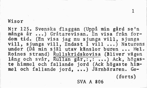 //// 1 //// Wisor //// N:r 125. Svenska flaggan (Uppå min gård se'n många år ...) Gråtarevisan. En visa från fordom tid. (En visa jag nu sjunga vill, sjunga vill, sjunga vill, Endast I vill ...) Naturens under (Då min själ utav känslor buren ... Mel, Roines strand) Rullskridskovisa (Bliver vägen lång och svår, Rullan går,:,: ...) Ack, högaste himmel och fallande jord (Ack högaste himmel och fallande jord, »..) Järnbäraren. Ge- //// (forts) //// SVA A 806 ////
