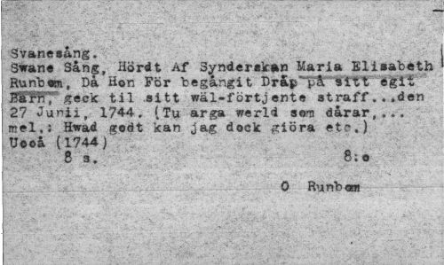 //// Svanesång, //// Swane Sång, Hördt Af Synderskan Maria Elisabeth //// Runbom, Då Hon För begångit Dr&|Tp& sitt égit MfrT;'geck til sitt wäl-förtjente straff...den 27 Jurii, 174-4. (Tu arga werld som dårar,,., mel,: Hwad gedt kan jag dock giöra etc.) Uooå (1744) //// 8 s. " 8:o //// 0 Runbaa ////