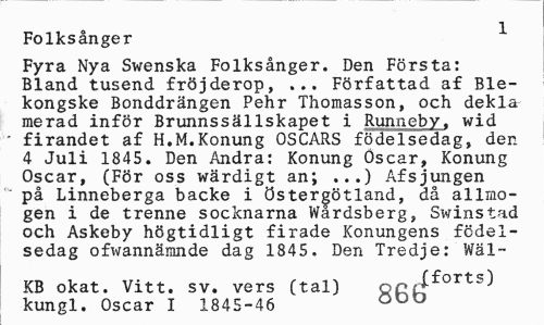 //// Folksånger //// Fyra Nya Swenska Folksånger. Den Första: Bland tusend fröjderop, ... Författad af Ble-kongske Bonddrängen Pehr Thomasson, och dekla merad inför Brunnssällskapet i Runneby, wid • firandet af H.M.Konung OSCARS födelsedag, den 4 Juli 1845. Den Andra: Konung Oscar, Konung Oscar, (För oss wärdigt an; ...) Afsjungen på Linneberga backe i Östergötland, då allmogen i de trenne socknarna Wårdsberg, Swinstad och Askeby högtidligt firade Konungens födelsedag ovannämnde dag 1845. Den Tredje: Wäl~ //// KB okat. Vitt. sv. vers (tal) Cfit{£°rtS') kungl. Oscar I 1845-46 000 ////
