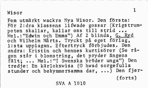 //// Wisor 1 //// Fem utmärkt wackra Nya Wisor. Den första: För 2:dra klassens lifwade gossar (Krigstrumpeten skallar, kallar oss till strid ... Mel.:"Edwin och Emma") Af 2 blinda, G t Ryd och Wilhelm Mårts. Tryckt på eget förlag, l:sta upplagan. Eftertryck förb judes. Den andra: Kristin och hennes kurtisörer (Se rågen står i blomstring, det pryder ängens fält; ... Mel.:"I Swenska bröder unga") Den tredje: En kärlekswisa (0 hwad sorgefulla stunder och bekymmersamma dar, ...) Den fjer- //// (forts) //// SVA A 1010 ////