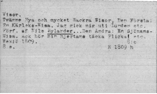 //// Visor. //// TVär-ne Nya och mycket flack ra Wisor, Ben Första; //// Kårl?ks-«i»a. Ja<r pick miy uti Lu^en etc. Förf. af Is Hylarder...Ben Andra; ®n Sjömans-Wjsa, Ack fccr mt* hjertans täcka Flicka I *»tc-. Texi c 1B09. 3:c //// 8 s. E 1809 h ////