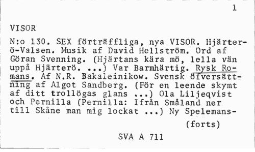 //// 1 //// VISOR //// N:o 130. SEX förträffliga, nya VISOR. Hjärter-ö-Valsen. Musik af David Hellström. Ord af Göran Svenning. (Hjärtans kära mö, lella vän uppå Hjärterö. ,..) Var Barmhärtig. Rysk Romans. Af N.R. Bakaleinikow. Svensk öfversätt-ning af Algot Sandberg. (För en leende skymt af ditt trollögas glans ...) Ola Liljeqvist och Pernilla (Pernilla: Ifrån Småland ner till Skåne man mig lockat ...) Ny Spelemans- //// (forts) //// SVA A 711 ////