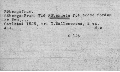 //// Bobergofrun. //// Röberga-Frun, Wid Rötergets fot- bodde fordom en Fru,... rnmtmamm //// Carlstad 1828, tr. G.Wallencrona, 2 ex. 4 s. . 8: o //// G 126 ////