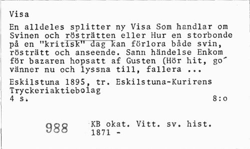//// Visa //// En alldeles splitter ny Visa Som handlar om Svinen och rösträtten eller Hur en storbonde på en "kritisk" dag kan förlora både svin, rösträtt och anseende. Sann händelse Enkom för bazaren hopsatt af Gusten (Hör hit, go"* vänner nu och lyssna till, fallera ... //// Eskilstuna 1895, tr. Eskilstuna-Kurirens Tryckeriaktiebolag //// 4 Si 8:0 //// qqq KB okat. Vitt. sv. hist. //// fOÖ 1871 _ ////