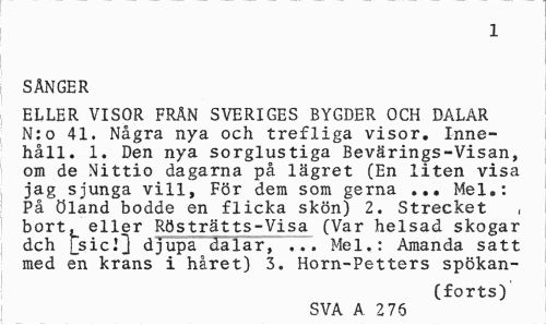 //// 1 //// SÅNGER //// ELLER VISOR FRÄN SVERIGES BYGDER OCH DALAR N:o 41. Några nya och trefliga visor. Innehåll. 1. Den nya sorglustiga Bevärings-Visan, om de Nittio dagarna på lägret (En liten visa jag sjunga vill, För dem som gerna ... Mel.: På Öland bodde en flicka skön) 2. Strecket , bort^ eller Rösträtts-Visa (Var helsad skogar dch [sic'1 djupa dalar, ... Mel.: Amanda satt med en krans i håret) 3. Horn-Petters spökan- //// (forts) //// SVA A 275 ////