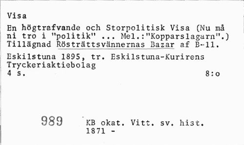 //// Visa //// En högtrafvande och Storpolitisk Visa (Nu må ni tro i "politik" ... Mel.:"Kopparslagarn".) Tillägnad Rösträttsvännernas Bazar af B-ll. //// Eskilstuna 1895, tr. Eskilstuna-Kurirens Tryckeriaktiebolag //// 4 s. 8:0 //// 989 KB okat. Vitt. sv, hist. //// 1871 - ////