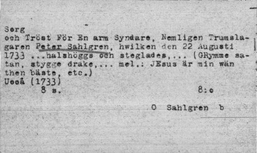 //// Ssrg //// och Tröst För En arm Syndare, Nemligen Trumslagaren fotar Sahlgren, hwilken den 22 Augusti 1733 . . .UalsV^^T*T2h steglades, . ,. (GRymme satan, stygge drake,... mel.: JEsus är min wän then bästa etc,} Uooå (1733) //// 3 s. 8:o //// 0 Sahlgren b ////