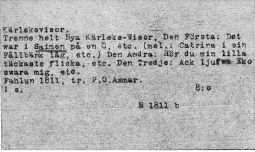 //// Kärlekavisor, //// Trenne helt Nya Kärleks-Wisor, Den Första; Bet //// war i Salman på an ö, etc. (mat.; Catrira i sin //// Få 11 c % rk TSfT, etc.) Don Andra; Hör du min lilla //// täckaste flicka, etc. Den Tredje: Ack ijufw» Eko //// svara mig, etö. //// Fahlun l8ll, tr. P.Q.Ajonar. //// 1 a. 8:o //// K 1811 b ////