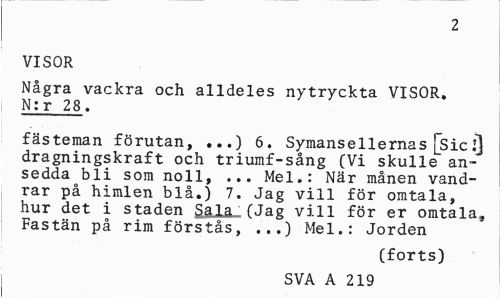 //// 2 //// VISOR //// Några vackra och alldeles nytryckta VISOR. N:r 28. //// fästeman förutan, ...) 6. Symansellernas [sicj] dragningskraft och triumf-sång (Vi skulle ansedda bli som noll, ... Mel.: När månen vandrar på himlen blå.) 7. Jag vill för omtala, hur det i staden (Jag vill för er omtala, //// Fastän på rim förstås, ...) Mel.: Jorden //// (forts) //// j SVA A 219 ////
