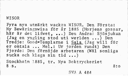 //// WISOR //// Fyra nya utmärkt wackra WISOR. Den Första: Ny Bewäringswisa för år 1885 Ofc>rjens gossar, här är det lifwet, ..=) Den Andra: Sjösjukan (Jag en yngling stod uti werlden ...) Den Tredje: Good-Templarne i Sala (Jag will för er omtala ... Mel.: Ur jorden rundt) Den Fjerde: Den förnöjde arbetaren (Wäl somliga sucka och klaga sin tid ...) //// Stockholm 1885, tr. Nya Boktryckeriet 8 s, 8:o //// SVA A 484 ////