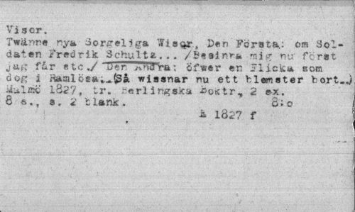 //// Visor. //// Twllrmf ny» Sorgeliga Wisctr, Den" Första.: om Soldaten Fredrik échulta... /Besinra mig nu' först jag får etc./ uen j-vnora; oftrer en Hicka isom dog i Haml ösa..*($å vissnar nu ett h len st er bort-J -iulffiö 1827, tr. rerlingska x>o«tr, 2 ex. 8 6., s. 2 t länk . 8:0 //// i 1Ö27 f ////