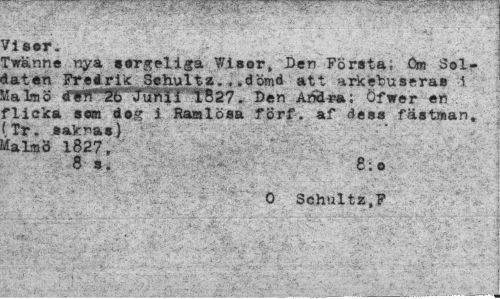 //// /ieer. //// rwänne nya »orgel i ga Wisor, Den Första; Om Sallaten Fredrik Sshultz. , .dömd att arkebuseras i ilalmS 4M ;i6 ™W- *>en Anclra; Öfwer en //// flicka som dog i Barnlösa förf. af dess fästman, (Tr. saknas) *almÖ 1827, //// 8 s. 8:0 //// O Schultz.P ////