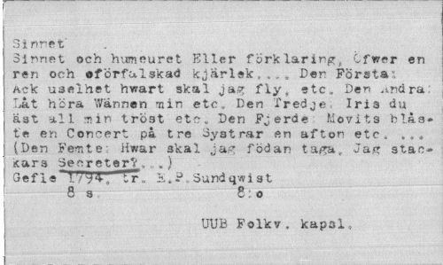 //// 3 i nr et' //// Sinnet och humeuret Eller förklaring, Cfwer en ren och oförfalskad kjarlek.. . , , Den Första-. Ack uselhet hwart skal jag fly, etc» Den Andra: Lat höra Wannen nin etc. Den Tredje Iris du äst ill min tröst etc. Den Fjerde Movits blåste en Concert pa tre Systrar en afton etc» (Dan Femte: Hwar skal jag födan taga, Jai? stan-» mars Secreter?,,.) Gefle tr ?, Sundqwi 31 //// 8 s £; o //// UUB Folkv. kapol. ////