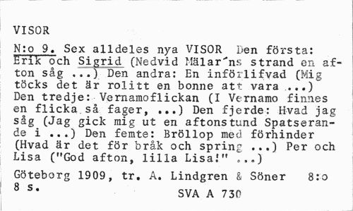 //// VISOR //// N:o 9. Sex alldeles nya VISOR Den första: Erik och Sigrid (Nedvid Mälarens strand en afton såg ...) Den andra: En införlifvad (Mig töcks det är rolitt en bonne att vara ,...) Den tredje: Vernamoflickan (I Vernamo finnes en flicka så fager, ...) Den fjerde: H-vad jag såg (Jag gick mig ut en aftonstund Spatseran-de i ...) Den femte: Bröllop med förhinder (Hvad är det för brå.k och spring ...) Per och Lisa ("God afton, lilla Lisa!" .,.) //// Göteborg 1909, tr. A. Lindgren & Söner 8:0 //// 8 S* SVA A 730 ////