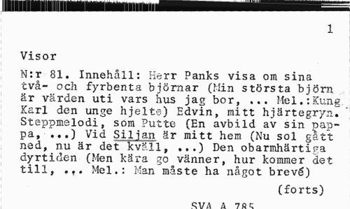 //// I—IW—H—I———— //// 1 //// Visor //// N:r 81. Innehåll: Herr Panks visa om sina två- och fyrbenta björnar (Min största björn är värden uti vars hus jag bor, ... Mel.:Kung. Karl den unge hjelte) Edvin, mitt hjärtegryn. Steppmelodi, som Putte (En avbild av sin pappa, ...) Vid Siljan är mitt hem (Nu sol gatt ned, nu är det kväll, ...) Den obarmhärtiga dyrtiden (Men kära go vänner, hur kommer det till, .Mel.: Man måste ha något brevé) //// (forts) ////