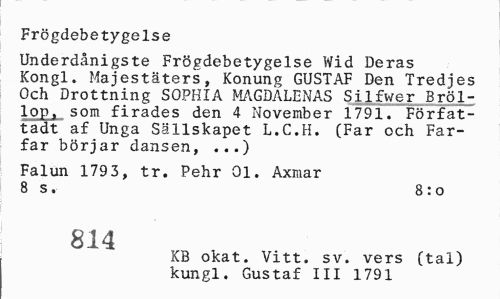 //// Frögdebetygelse //// Underdånigste Frögdebetygelse Wid Deras Kongl. Majestäters, Konung GUSTAF Den Tredjes Och Drottning SOPHIA MAGDALENAS Silfwer Brölr lop, som firades den 4 November 1791. Förfat-tadt af Unga Sällskapet L.C.H. (Far och Farfar börjar dansen, ...) //// Falun 179 3, tr. Pehr 01. Axmar 8 s. 8: o //// 814 //// KB okat. Vitt. sv. vers (tal) kungl. Gustaf III 1791 ////