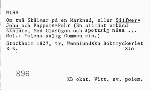 //// WISA //// Om twå Skälmar på en Marknad, eller Silfwer= John och Pappers=Pehr (En allmänt erkänd skojare, Med Glasögon och spettsig näsa Mel.: Malena salig Gumman min.) //// Stockholm 1827, tr. Wennlundska Boktryckeriet 8 s. 8:0 //// 896 //// KB okat. Vitt, sv. polem. ////