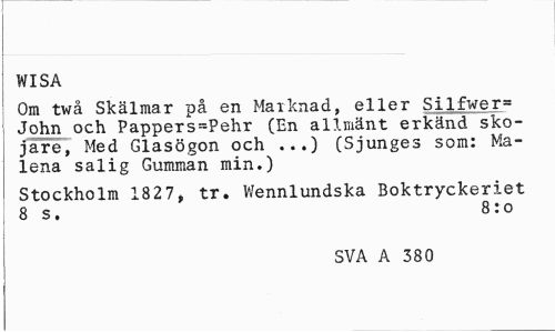 //// WISA //// Om twå Skälmar på en Marknad, eller Silfwer= John och Pappers=Pehr (En allmänt erkänd skojare, Med Glasögon och ...) (Sjunges som: Malena salig Gumman min.) //// Stockholm 1827^ tr. Wennlundska Boktryckeriet 8 s. 8:o //// SVA A 380 ////