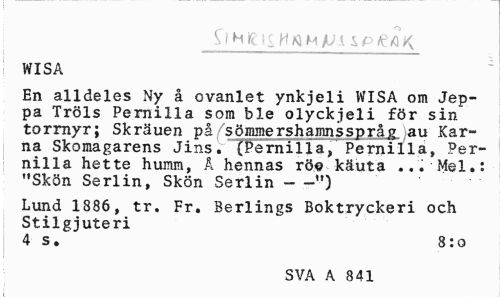 //// WISA //// En alldeles Ny å ovanlet ynkjeli WISA om Jep-pa Tröls Pernilla som ble olyckjeli för sin torrnyr; Skräuen på sömmershamnsspråg au Karna Skomagarens Jins. (Pernilla, Pernilla, Pernilla hette humm, Å hennas rö<? käuta ... Mel.: "Skön Serlin, Skön Serlin - -") //// Lund 1886, tr. Fr. Berlings Boktryckeri och Stilgjuteri //// 4 s. 8:0 //// SVA A 841 ////