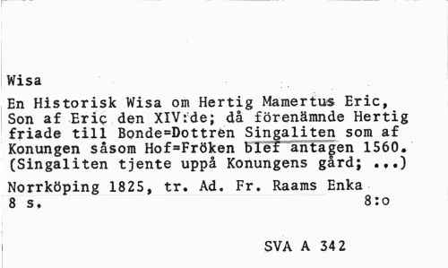 //// Wisa //// En Historisk Wisa om Hertig Mamertus Eric, Son af Eric den XlVrde; då förenämnde Hertig friade till Bonde=Dottren Singaliten som af Konungen såsom Hof=Fröken blef antagen 1560. (Singaliten tjente uppå Konungens gård; .,.) //// Norrköping 1825, tr. Ad. Fr, Raams Enka 8 s, 8:o //// SVA A 34 2 ////