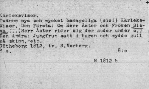 //// kärleksvisor. //// [Värme nya och mycket bahageliga (sici) Kärleksvisor, Den Första: Qra Herr Aster och Fröken 3is-jg^ .'"'V .(Herr Aster rider sig der söder under "oTT 3en Andra: Jungfrun satt i "buren nch sydde gull >å, skinn, -etc. //// Jötheborg 1812, tr. 3.Norberg. ? s. 8:o //// N 1812 t ////