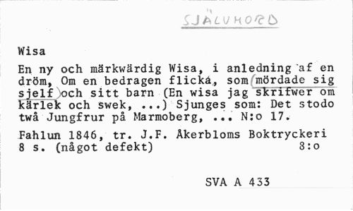 //// SJPLW HO^Ö //// Wisa //// En ny och märkwärdig Wisa, i anledning 'af en dröm, Om en bedragen flickå,, som mördade sig sjelf och sitt barn (En wisa jag skrifwer om kärlek och swek, ...) Sjunges som: Det stodo twå Jungfrur på Marmoberg, ... N:o 17. //// Fahlun 1846, tr. J.F. Åkerbloms Boktryckeri 8 s. (något defekt) 8:o //// SVA A 433 ////