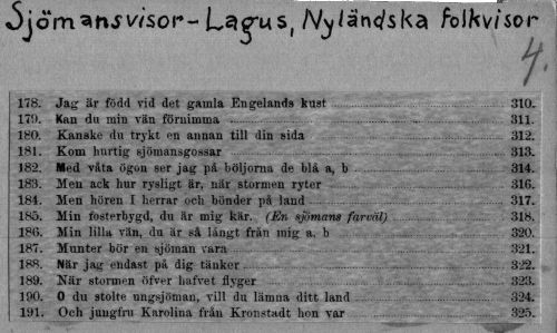 //// Ojom^njwsor-/vyantfska roJftwsor //// 178. Jag är född vid det gamla Engelands kust 310- //// 179. Kan du min vän förnimma ... 311. //// 180. Kanske du trykt en annan till din sida 312. //// 181. Kom hurtig sjömansgossar ... 313. //// 182. Med v&ta ögon ser jag på böljorna de blå a, b 314. //// 183. Men ack hur rysligt är, när stormen ryter ...316. //// 184. Men hören 1 herrar och bönder på land... 317. //// 185. Min fosterbygd, du är mig kär. (En sjömans farväl) 318. //// 186. Min lilla vän, du är så långt från mig a. b 320. //// 187. Munter bör en sjöman vara ... 321. //// 188. När jag endast på dig tänker...322. //// 189. När stormen öfver hafvet flyger ... 323. //// 190. O du stolte ungsjöman, vill du lämna ditt land 324. //// 191. Och jungfru Karolina från Kronstadt hon var 325. ////