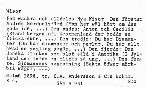 //// Wisor //// Fsm wackra och alldeles Nya Wisor Den förstår Andrés Nordpols färd (Han har wäl hört om den goda idé, ...) Den andra: Anton och Cecilia (Bland bergen uti Westmanland der bodde en flicka skön, ...) Den tredje: Du har Diamanter (Du har diamanter och perlor, Du har allt hwad en yngling begär, ...) Den fjerde: Den danska flickan som blef såld i Amerika (I Jylland der lefde en flicka så ung, ...) Den femte. Sjömannens begrafning (Sakta öfwer mörkblå wågor, 777) //// Malmö 1898, tr. C.A. Andersson & C:s boktr. 8 S> SVA A 931 8:0 ////