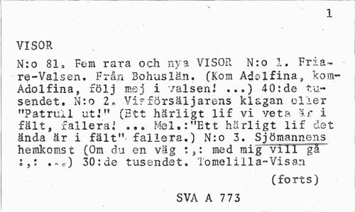 //// 1 //// VISOR //// N:o 81» Fem rara och nya VISOR N:o 1. Fria-re-Valsen. Från Bohuslän. (Kom Adolfina, kom-Adolfina, följ mej i valsen! ...) 40:de tu-sendet. N:o 2„ Vi?försäljarens klagan eller "Patrull uti" (Ett härligt lif vi veta är i fält, fallera! ... Mel.:"Ett härligt lif det ända är i fält"' fallera.) N:o 3. Sjömannens hemkomst (Om du en väg med mig vill gä ;,; ..o) 30:de tusendet. Tomelilla-Visan //// (forts) //// SVA A 7 73 ////