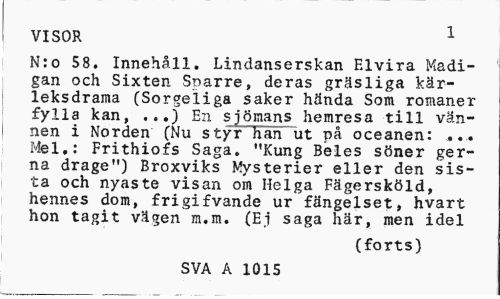 //// VISOR 1 //// N:o 58. Innehåll. Lindanserskan Elvira Madi-gan och Sixten Sparre, deras gräsliga kärleksdrama (Sorgeliga saker hända Som romaner fylla kan, ...) En sjömans hemresa till vännen i Norden (Nu styr han ut på oceanen: ... Mel.: Frithiofs Saga. "Kung Beles söner ger-na dragé") Broxviks Mysterier eller den sista och nyaste visan om Helga Fägersköld, hennes dom, frigifvande ur fängelset, hvart hon tagit vägen m.m. (Ej saga här, men idel //// (forts) //// SVA A 1015 ////