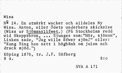 //// Wisa //// 24. En utmärkt wacker och alldeles Ny Wisa. Anton, eller ödets underbara skickelse (Wisa ur Sjömanslifwet.) (På Stockholms redd wid Skeppsbron, ... Sjunges som:"Hör, sjöman", Lisken sade, "Jag wille öfwer sjön."' eller: "Kung Ring han satt i högbänk om julen och drack mjöd.") //// Köping 1876, tr. J.F. Säfberg 8 s. 8:o //// SVA A 58 171 ////