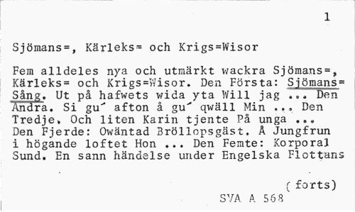 //// 1 //// Sjömans=, Kärleks^ och Krigs=Wisor //// Fem alldeles nya och utmärkt wackra Sjömans=, Kärleks= och Krigs=Wisor. Den Första: Sjömans = Sång. Ut på hafwets wida yta Will jag Den Andra. Si gu" afton å gu' qwäll Min ... Den Tredje. Och liten Karin tjente På unga ... Den Fjerde: Owäntad Bröllopsgäst. Å Jungfrun i högande löftet Hon ... Den Femte: KorporaJ Sund. En sann händelse under Engelska Flottans //// ( forts) //// SVA A. 56 8 ////