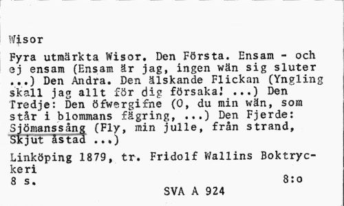 //// Wisor //// Fyra utmärkta Wisor. Den Första. Ensam - och ej ensam (Ensam är jag, ingen wän sig sluter //// Den Andra. Den älskande Flickan (Yngling skall jag allt för dig försaka,' ...) Den Tredje: Den öfwsrgifne (0, du min wän, som står i blommans fägring, ...) Den Fjerde: Siömanssång (Fly, min julle, från strand, Skjut åstad ...) //// Linköping 1879, tr. Fridolf Wallins Boktryckeri //// 8 s. 8:o //// sva a 924 ////