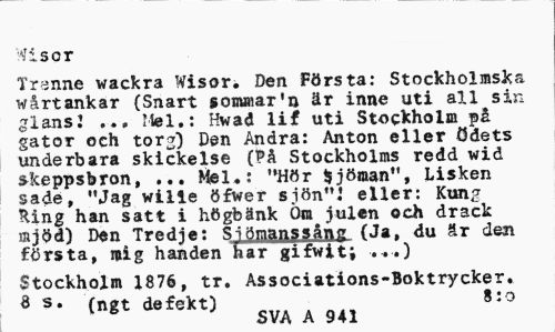 //// Wisor //// Trenne wackra Wisor. Den Första: Stockholmska wårtankar (Snart »ömmar'!» är inne uti all sin glans! ... Mel,: Hwad lif uti Stockholm på gator och torg) Den Andra: Anton eller ödets underbara skickelse (På Stockholms redd wid skeppsbron, ... Mel,: "Hör Sjöman", Lisken sade, "Jag wille öfwer sjön".' eller: Kung Hing han satt i högbänk Öm julen och drack mjöd) Den Tredje: Si ömanssång (Ja. du år den första, mig handen har gifwit; ...) //// Stockholm 1876, tr. Associations-Boktrycker. 3 s. (ngt defekt) 8:0 //// SVA A 941 ////