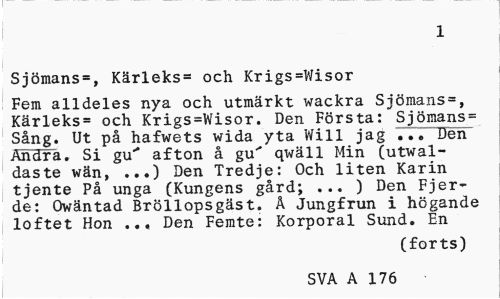 //// 1 //// I //// Sjömans®, Kärleks= och Krigs=Wisor //// Fem alldeles nya och utmärkt wackra Sjömans=, Kärleks= och Krigs=Wisor. Den Första: Sjömans= Sång. Ut på hafwets wida yta Will jag ... Den Andra. Si gu"* afton å gu' qwäll Min (utwal-daste wän, ...) Den Tredje: Och liten Karin tjente På unga (Kungens gård; ... ) Den Fjer-de: Owäntad Bröllopsgäst. Å Jungfrun i högande löftet Hon ... Den Femte: Korporal Sund. En //// (forts) //// SVA A 176 ////