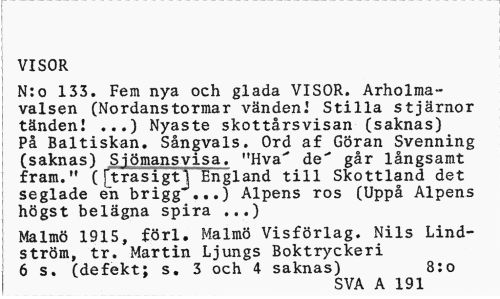 //// VISOR //// N:o 133. Fem nya och glada VISOR. Arholma-valsen (Nordanstormar vändeni Stilla stjärnor tänden! ...) Nyaste skottårsvisan (saknas) På Baltiskan. Sångvals. Ord af Göran Svenning (saknas) Sjömansvisa. "Hva" de" går långsamt fram." ( [trasigtT England till Skottland det seglade en brigg ...) Alpens ros (Uppå Alpens högst belägna spira ...) //// Malmö 1915, förl. Malmö Visförlag. Nils Lindström, tr. Martin Ljungs Boktryckeri 6 s. (defekt: s. 3 och 4 saknas) 8:o //// SVA A 191 ////
