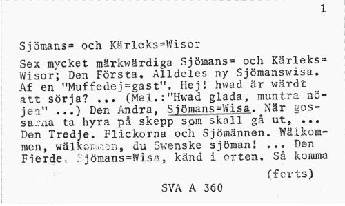 //// 1 //// Sjömans» och Kä.rleks=Wisor //// Sex mycket märkwärdiga Sjömans» och Kärleks» Wisor; Den Första. Alldeles ny Sjömanswisa. Af en "Muffedej =gast". Hej! hwad är wärdt att sörja? ... (Mel.:"Hwad glada, muntra nöjen" ...) Den Andra, Sjömans»Wisa. När gossarna ta hyra på skepp som skall gå ut, ... Den Tredje. Flickorna och Sjömännen. Wälkom-men, wälkorcssn, du Swenske sjöman! ... Den Fierde ^jömans=Wisa, känd i orten. Så komma //// (forts) //// SVA A 360 ////