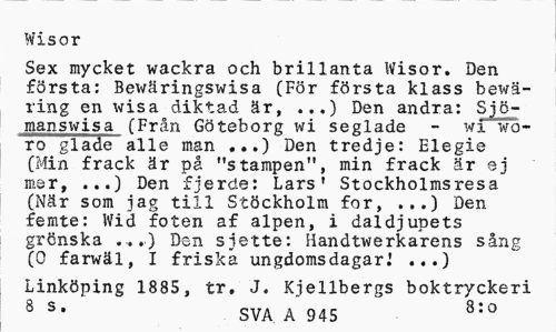 //// Wisor //// Sex mycket wackra och brillanta Wisor. Den första: Bewäringswisa (För första klass bewä-ring en wisa diktad är, ...) Den andra: S jö-manswisa (Från Göteborg wi seglade - wi wö-ro glade alle man ...) Den tredje: Elegie (Min frack är på "stampen", min frack är ej mer, ...) Den fjerde: Lars' Stockholmsresa (När som jag till Stockholm for, ...) Den femte: Wid foten af alpen, i daldjupets grönska .-,.) Den siette: Handtwerkarens sång (Q farwäl, I friska ungdomsdagarJ ...) //// Linköping 1885, tr. J. Kjellbergs boktryckeri //// 3 S* SVA A 945 8:0 ////