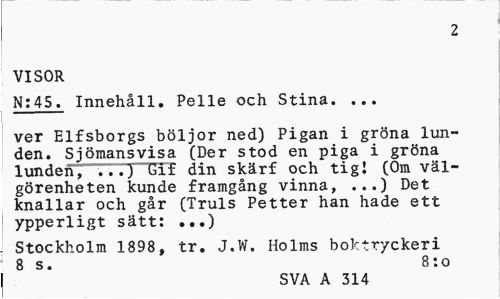 //// 2 //// VISOR //// N:45. Innehåll. Pelle och Stina. ... //// ver Elfsborgs böljor ned) Pigan i gröna lunden. Sjömansvisa (Der stod en piga i gröna lunden, ...) bit din skärf och tig! (Om välgörenheten kunde framgång vinna, ...) Det knallar och går (Truls Petter han hade ett ypperligt sätt: ...) //// Stockholm 1898, tr. J.W. Holms boktryckeri 8 s. 8:o //// SVA A 314 ////