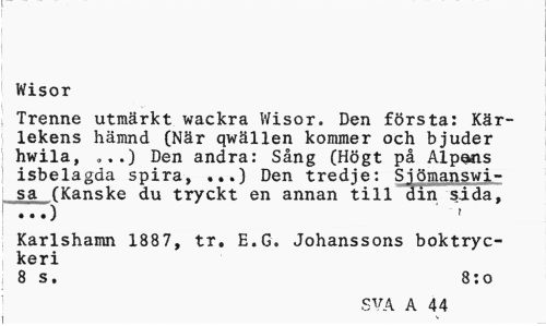//// Wisor //// Trenne utmärkt wackra Wisor. Den första: Kärlekens hämnd (När qwällen kommer och bjuder hwila, Den andra: Sång (Högt på Alpans //// isbelagda spira, ...) Den tredje: Siömanswj-sa (Kanske du tryckt en annan till din sida, ...) ' //// Karlshamn 1887, tr. E.G. Johanssons boktryckeri //// 8 s. 8:0 //// SVA A 44 ////