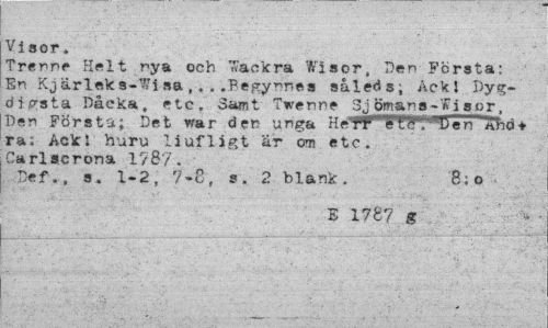 //// Visor, //// Trennf Halt nya och Vackra Wisor, Den Första; En Kjarleka-Wisa,...Begynnes såleds; Ackl Dyg-di^B.ta Dåcka . etc. 3amt Twenne 3j öman a-* i sor. Den Första; Det war den unga HéW Wlft^Uen Ähd* ra; Ack i huru liufligt är om etc. Carlscrona 1787. Def.. s. 1.2, 7-C, s. 2 blank. 8;o //// i ¦' ' r - * - ' . ' '"" ¦¦;' •-""*-;. • ¦ ' , "V //// E 1787 g //// " ,. ¦¦¦ . ___¦ • ..¦• 'Jt^.U^iöiÄ //// , .;-:. v:¦•';'.¦ f.l '.-'; ¦'... ,.¦. • . - " //// ; r iL;" V ' i1:."" ' - -".V"'""'"'' ////