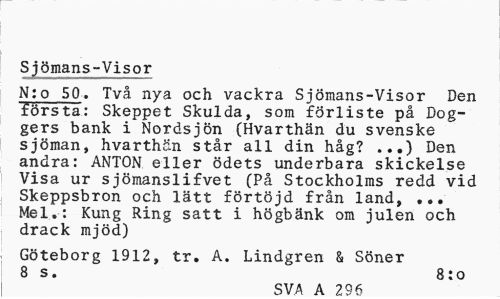 //// S jömansj-Visor //// N:o 50. Två nya och vackra Sjömans-Visor Den första: Skeppet Skulda, som förliste på Dog-gers bank i Nordsjön (Hvarthän du svenske sjöman, hvarthän står all din håg? ...) Den andra: ANTON eller ödets underbara skickelse Visa ur sjömanslifvet (På Stockholms redd vid Skeppsbron och lätt förtöjd från land, ... Mel.: Kung Ring satt i högbänk om julen och drack mjöd) //// Göteborg 1912, tr. A. Lindgren & Söner 8 s. 8:o //// SVA A 70 6 ////